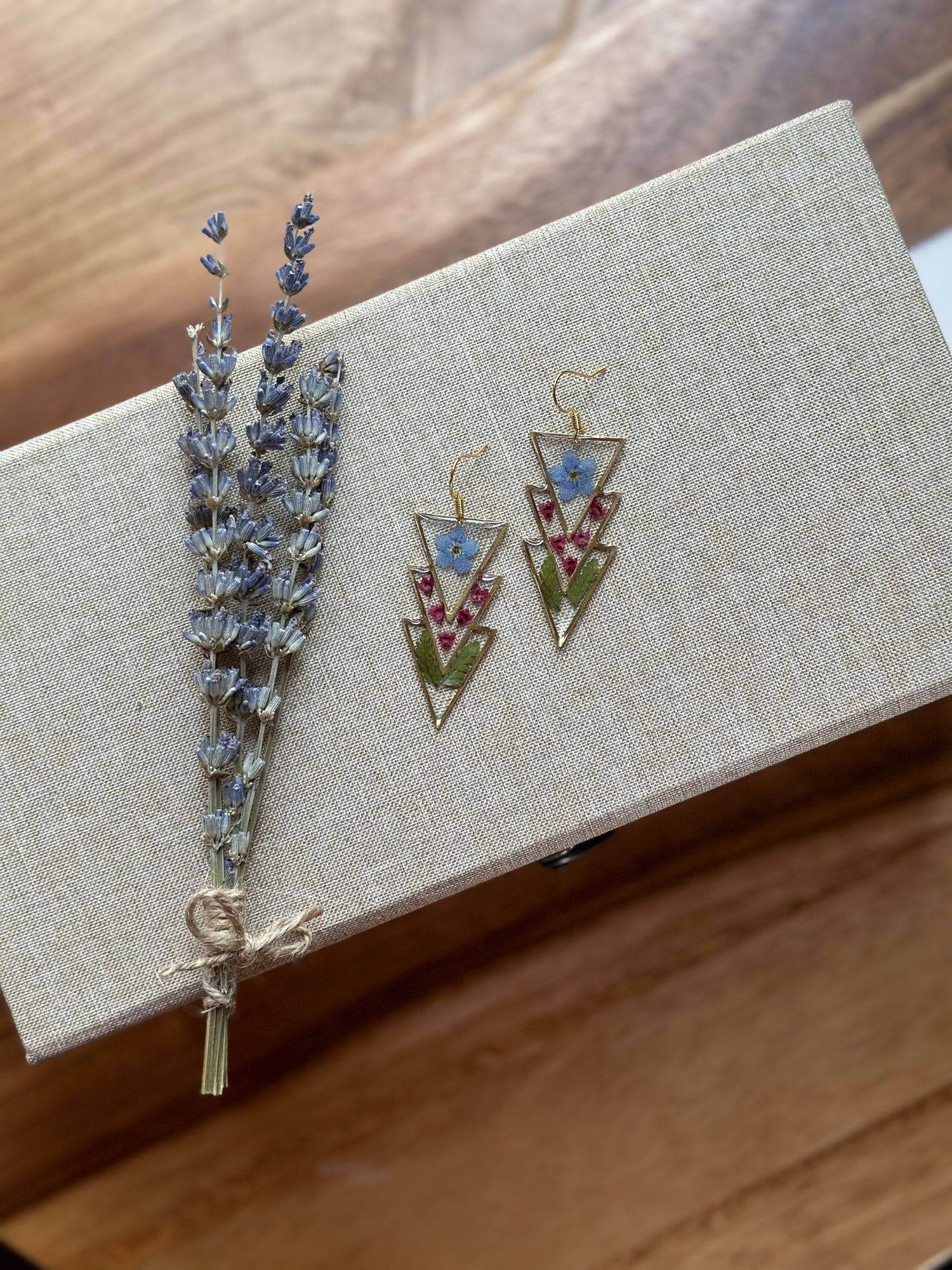 Arrow shaped earrings with forget me nots, coral bells and ferns. Comes on gold plated, sterling silver hooks. Lightweight and perfect for everyday! Handmade with love 💕Â
